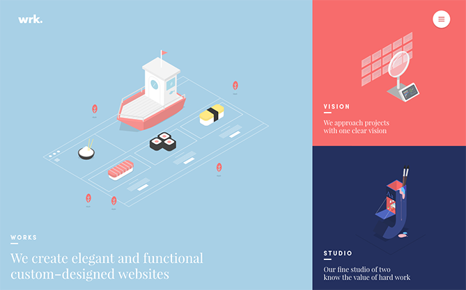El diseño modular sin duda seguirá presente en 2017. Es una fórmula infalible para crear sitios web organizados y accesibles que mantienen el interés de los visitantes. Este ejemplo del estudio de diseño Waaark le añade un toque extra al diseño modular: cuando colocas el cursor del ratón sobre los bordes que dividen los módulos, notarás un efecto de ondulaciones totalmente inesperado.