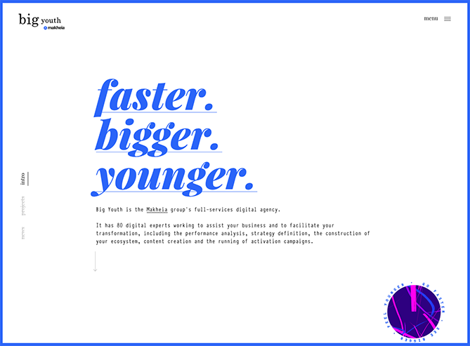 Cada vez son más las empresas que utilizan una tipografía grande y llamativa para presentar sus páginas principales. Este estilo funciona mejor cuando el resto de la página tiene una apariencia minimalista e inmaculada, como en el siguiente ejemplo de la agencia francesa Big Youth.