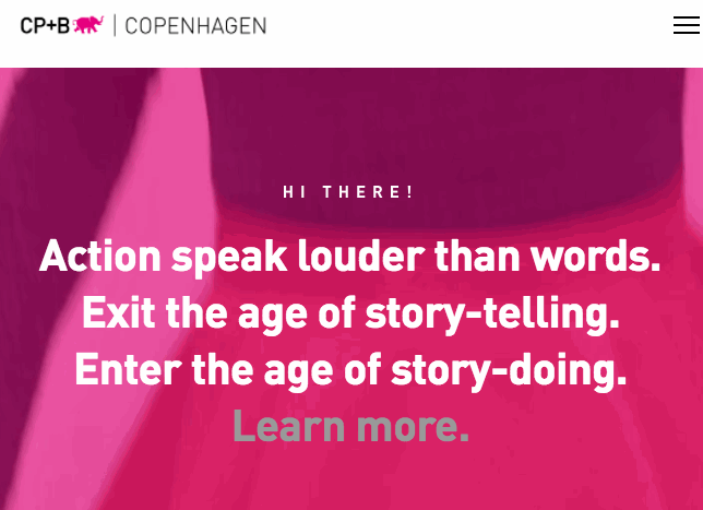 Las cinemagrafías son videos o GIFS de alta calidad que se reproducen de manera continua y fluida. Han ganado popularidad como una manera de agregar movimiento y atractivo visual a páginas estáticas. La visualización continua en pantalla completa, como la que vemos en este excepcional ejemplo de la agencia danesa CP+B Copenhagen, logran captar la atención de los visitantes durante más tiempo.