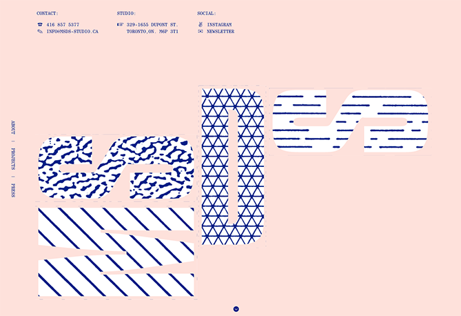 Las formas y los patrones extravagantes están cada vez más presentes en los sitios web, y dotan de un cierto atractivo a un entorno dominado por diseños planos y materiales. En su página principal, el estudio de diseño canadiense MSDS hace uso de letras atrevidas conformadas por patrones.
