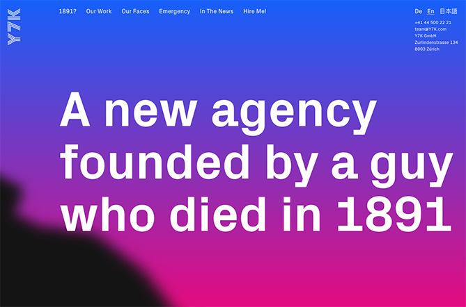 El efecto de degradado caleidoscópico ha vuelto pisando fuerte. La agencia Y7K, ubicada en Zúrich, nos brinda un ejemplo perfecto de cómo lograr que este efecto de degradé con dos tonalidades que abarca toda la pantalla de su página principal otorgue una apariencia moderna e innovadora.