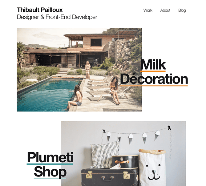 El efecto de texto que se superpone ligeramente con las imágenes ha ganado popularidad en los blogs y los portafolios. El director artístico independiente y desarrollador de interfaces Thibault Pailloux destaca el texto superpuesto con un subrayado colorido.