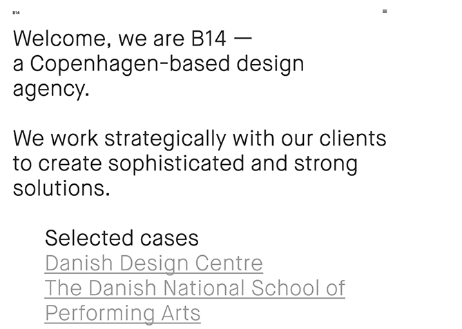 La agencia danesa B14 usa su propia página principal para describir en pocas palabras la misión de la empresa e incluir enlaces a muestras de su trabajo. Se trata de un enfoque moderno y ligero para presentar la información.