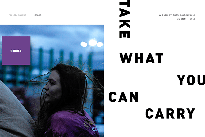 Abandonar las convenciones y colocar texto de manera vertical en lugar de horizontal en una página le añade originalidad. Observa este ejemplo del director Matt Porterfield, donde se mezclan alineaciones horizontales y verticales en una página que, de otro modo, nos parecería demasiado simple.