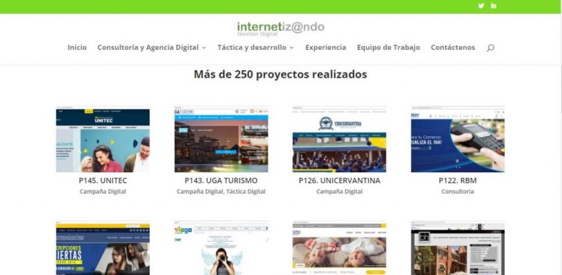 Agencia Digital y Consultora fundada en el año 2008, con más de 250 proyectos documentados; desarrollados para grandes y pymes principalmente en Colombia y EEUU. Su portafolio se compone de consultoría, planeación digital, posicionamiento en buscadores, diseño de sitios web, manejo de redes sociales y planeación de la estrategia digital. www.internetizando.com