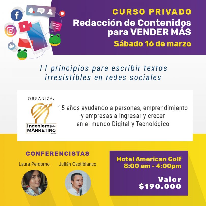 El sábado 16 de marzo a partir de las 8:00 de la mañana se dará inicio al primer curso de privado en el que aprenderás los 11 principios básicos para escribir textos irresistibles en redes sociales. Julián Castiblanco #MarketingCoach y Laura Perdomo #ContentCreator enseñarán un paso a paso de técnicas y claves para consolidar marcas que comuniquen efectivamente su valor diferencial. Los conferencistas actualmente desarrollan y ejecutan estrategias para más de 15 clientes entre emprendimientos, marcas personales y empresas.