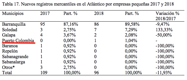 Según el informe entregado por la Cámara de Comercio de Barranquilla el 30 de enero del presente año, Puerto Colombia en 2018 se ubicó en la cuarta posición de la tabla “Nuevos registros mercantiles en el Atlántico por empresas pequeñas 2017 y 2018” debajo de Galapa, Soledad y Barranquilla.
