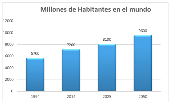 El aumento de la población mundial plantea una serie de demandas ambientales, económicas y sociales muy altas. Las necesidades humanas básicas a suplir son: alimentación, vivienda, calor, energía, vestido y bienes de consumo lo cual requiere un cantidad considerable de recursos naturales, entre ellos el AGUA. Si no se producen cambios en la tecnología, el uso de la tierra y las medidas de control de la natalidad, esta demanda aumentará dramáticamente.