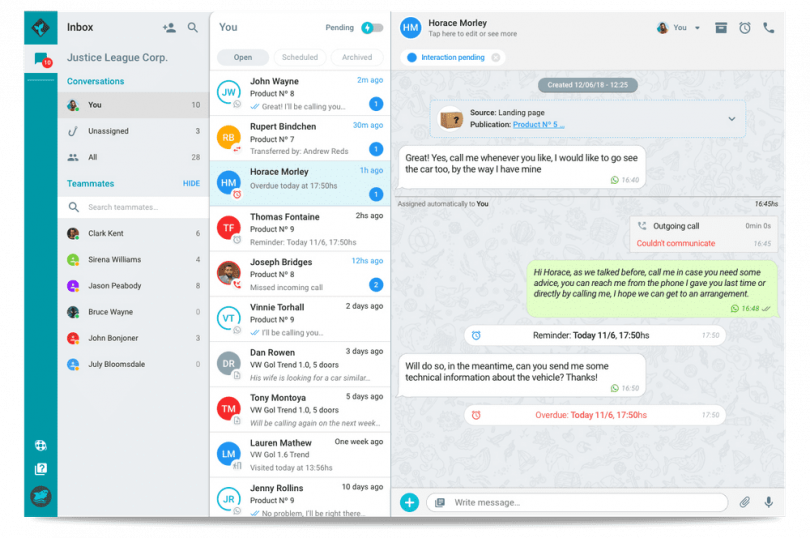 Para equipos comerciales asignación automática y exclusiva de nuevos clientes. Para equipos de atención y administración una bandeja de consultas compartida. Disponible en la computadora y en las apps nativas de Android y IOS.