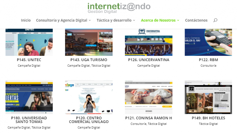 Agencia Digital y Consultora fundada en el año 2008, con más de 250 proyectos documentados; desarrollados para grandes y pymes principalmente en Colombia y EEUU. Su portafolio se compone de consultoría, planeación digital, posicionamiento en buscadores, diseño de sitios web, manejo de redes sociales y planeación de la estrategia digital. www.internetizando.com